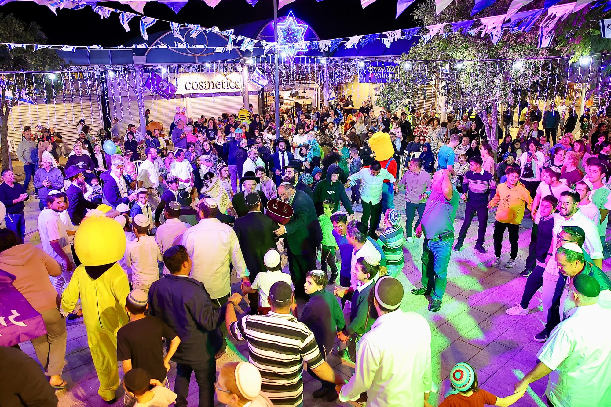 המוני תושבי נוף הגליל השתתפו במוצאי חג 'שמחת חורה' באירוע ההקפות השניות במרכז רסקו * המתחם קושט בתאורה נוצצת ומארזי ממתקים והפתעות חולקו לילדים |