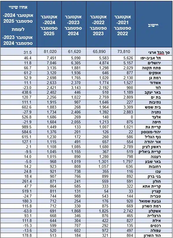 נכון לסוף ספטמבר 2025, מספר הדירות בבנייה פעילה עמד על כ־203,310 דירות, כאשר כמחצית מהן מרוכזות במחוז תל אביב ובמחוז המרכז. היקף זה משקף מלאי משמעותי של פרויקטים בשלבי ביצוע שונים, שחלק ניכר מהם מבוסס על הריסה ובנייה מחדש בלב אזורים עירוניים ותיקים.